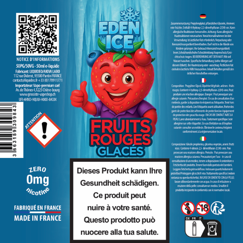 Eden Ice Fruits Rouges Glacée 50ml 0mg, Découvrez toute la richesse aromatique des fruits rouges glacés. À l’inhalation, la framboise, la fraise et la mûre se mêlent pour offrir une explosion de saveurs gourmandes et légèrement acidulées. Ces notes fruitées sont ensuite enveloppées par une vague de fraîcheur givrée, qui intensifie la dégustation et apporte une sensation vivifiante à chaque bouffée. L’alliance de la douceur des baies et de la puissance de la glace crée une vape désaltérante, équilibrée et irrésistible. Idéal pour les amateurs de fruités intenses et rafraîchissants, ce liquide est un incontournable à savourer toute la journée. Important : E-liquide boosté en arômes, vendu en flacon de 50ml.