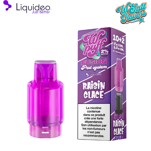 Découvrez le Pod Wpuff Raisin Glacé Fusion Liquideo, spécialement conçu pour être utilisé avec le Kit Wpuff Fusion. Offrez-vous une expérience de vapotage intense et savoureuse avec une saveur de raisin gourmand revisitée avec une note de fraîcheur, parfaitement retranscrite grâce à son coil mesh.