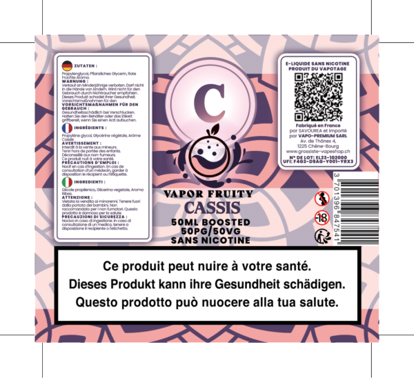 Vapor-Fruity Cassis 50ml 0mg : Découvrez dès maintenant la gamme Vapor-Fruity ! Si vous avez apprécié vapoter la gamme Vapor-Fresh, vous allez adorer sa déclinaison no-fresh. Retrouvez toute l’intensité des arômes pour une expérience de vapotage exceptionnelle.